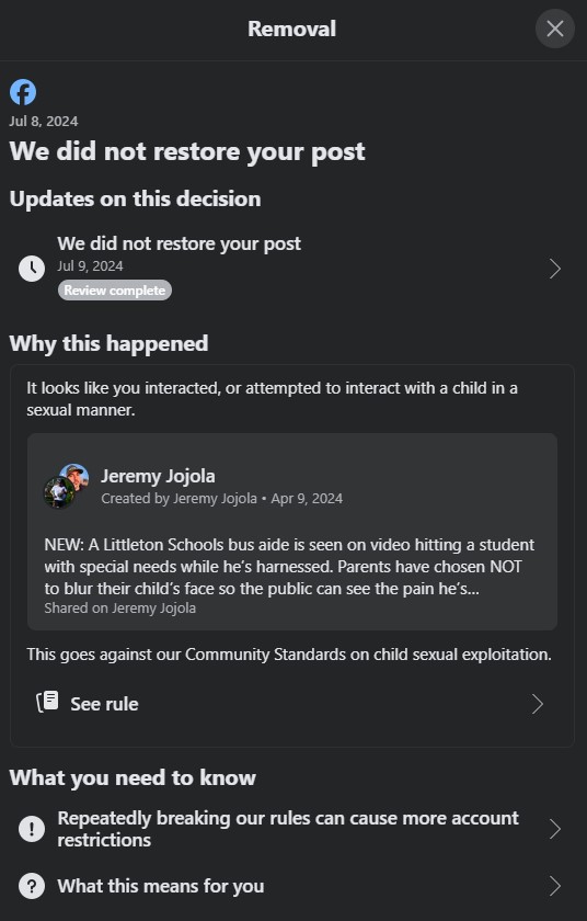 The automatic moderation system flagged a post of mine from April in which I posted a news story I did about a school bus aide seen on video abusing non-verbal children.